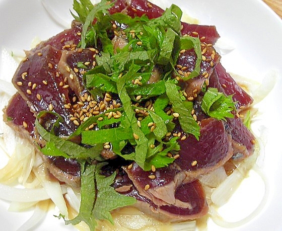 大葉たっぷりカツオの叩きの漬けサラダ レシピ 作り方 By デラみーやん 楽天レシピ